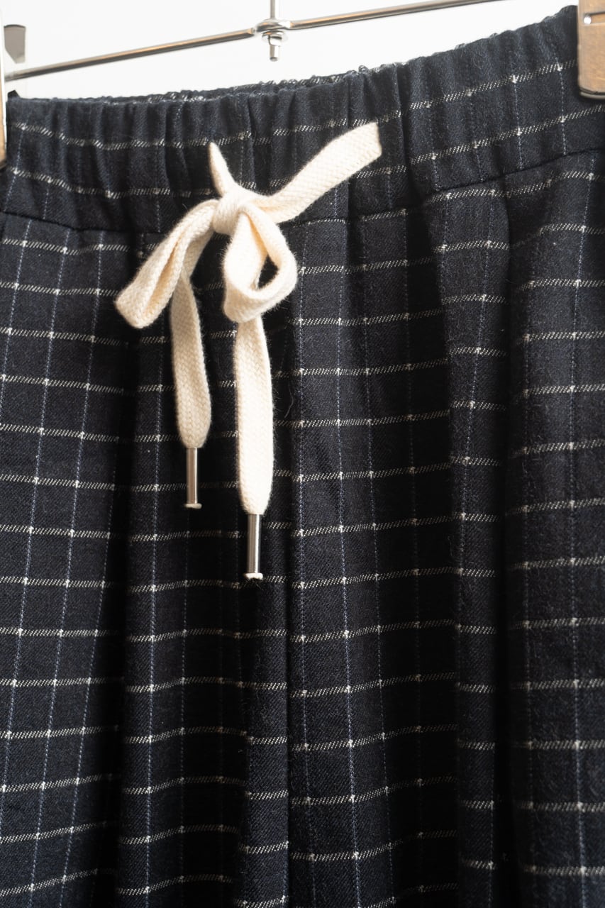クラシックで上品なチェック柄をあえてルーズに楽しむ、CONICHIWA BONJOURらしい遊び心が感じられます。ワタリから裾までゆったりとしたシルエットで、ウエストもドローコード付きのイージー仕様なので、楽に着用していただけます。
