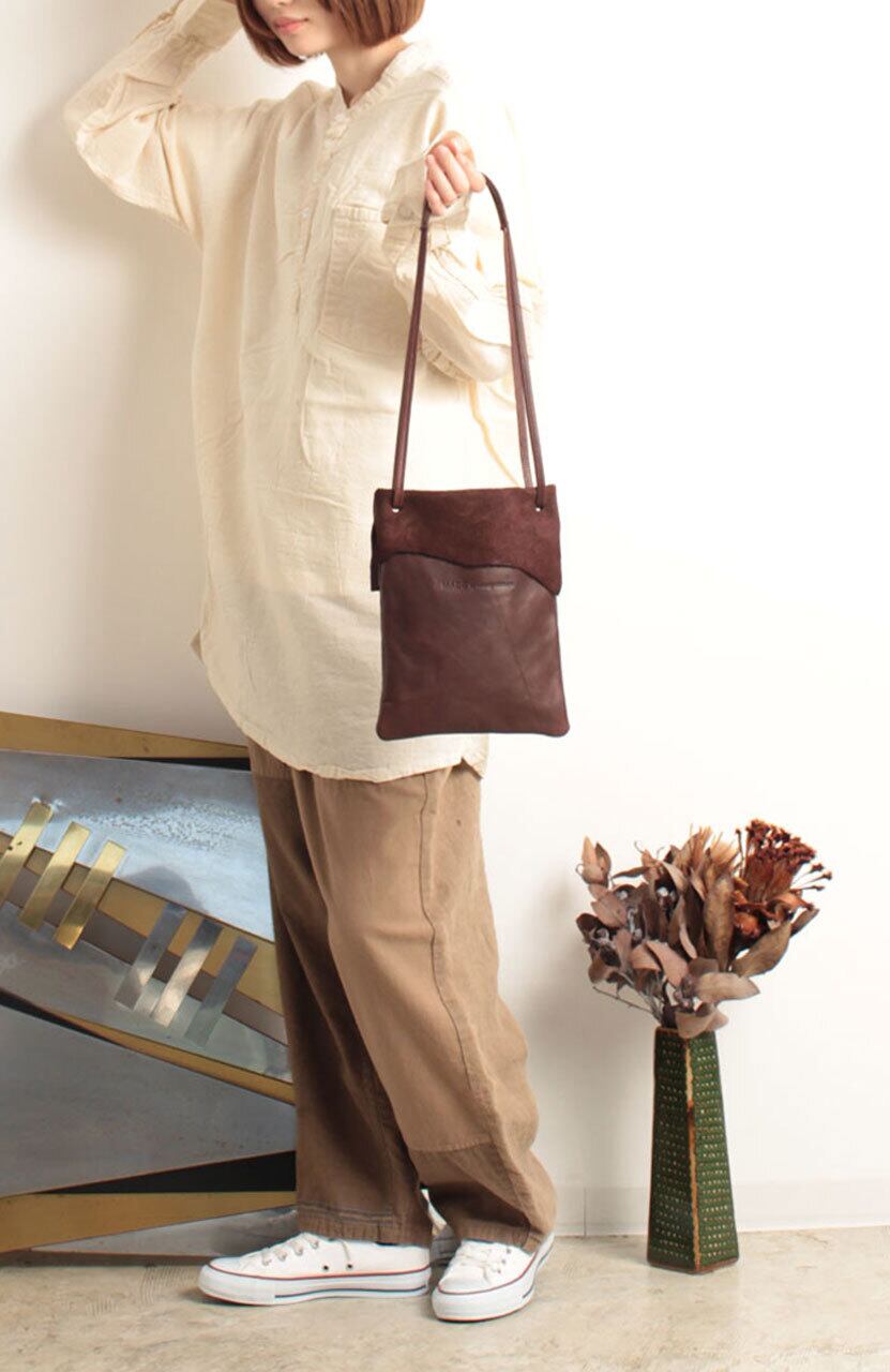 こちらのポーチ(サコッシュ)は革製品の製作工程で出た端材を活かして作られています。留め具やポケットなどのないシンプルなデザインは、着る服を選びません。