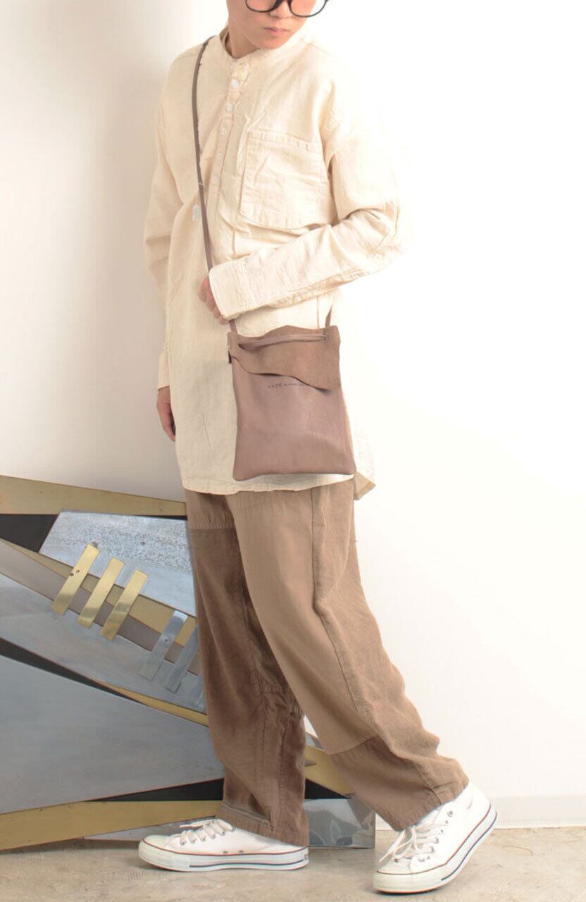 こちらのポーチ(サコッシュ)は革製品の製作工程で出た端材を活かして作られています。留め具やポケットなどのないシンプルなデザインは、着る服を選びません。